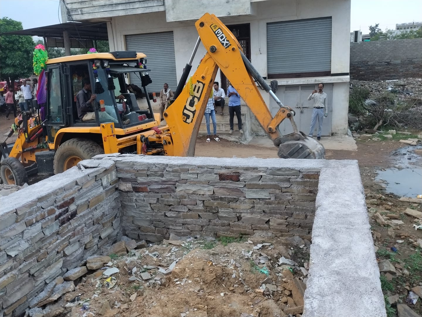 जेसीबी से अवैध निर्माण को ध्वस्त करते हुए