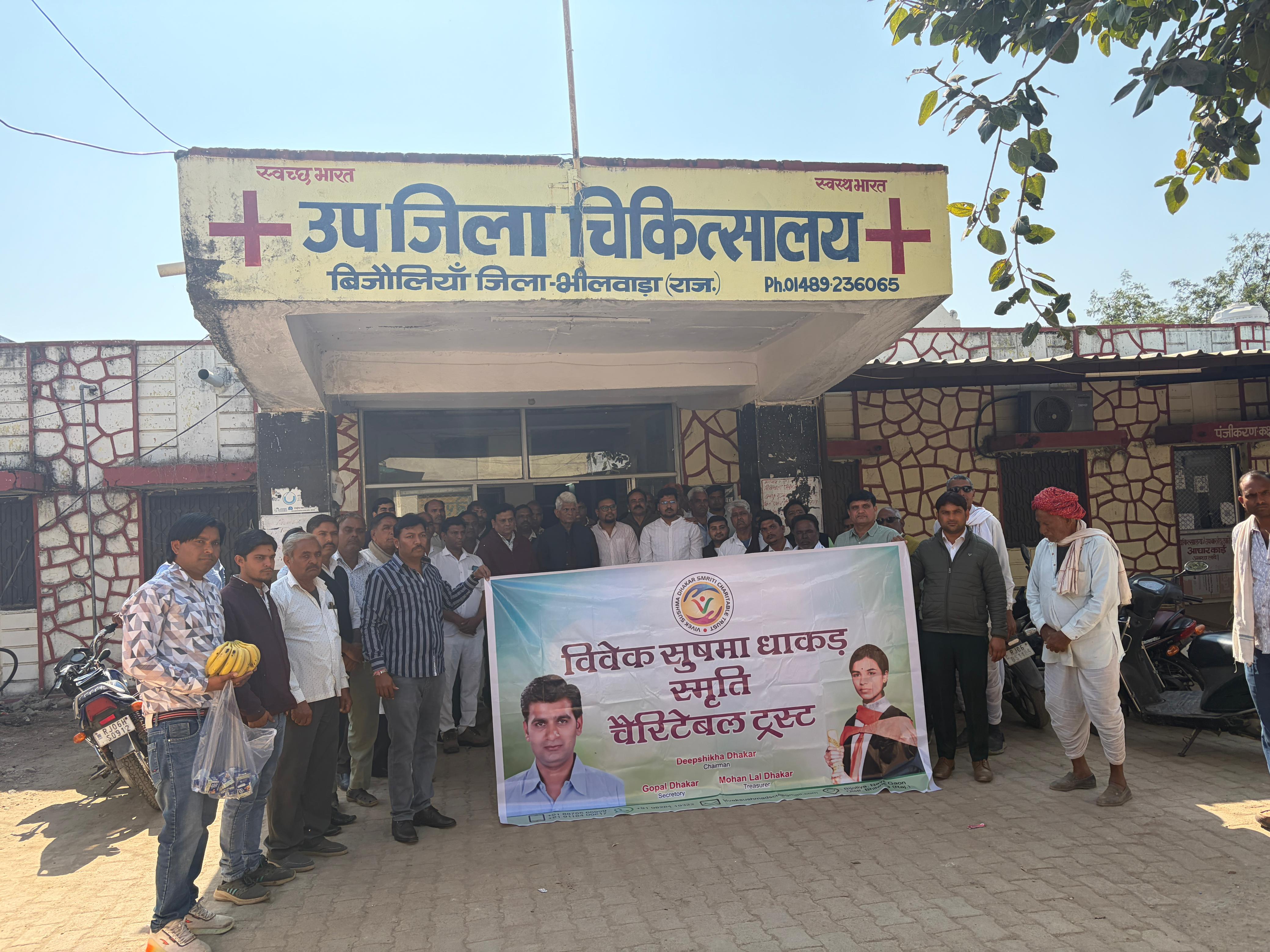 पूर्व विधायक स्वर्गीय विवेक धाकड़ के द्वितीय जन्मदिन के अवसर उनकी स्मृति में जन हितार्थ कार्यो के लिए पूर्व जिला प्रमुख इंजीनियर कन्हैया लाल धाकड़ द्वारा बनाये गये विवेक सुषमा धाकड़ चेरेटिबल द्वारा परोपकार दिवस के रूप में दो दिवसीय जनसेवा के रूप मे कार्य करने का कार्यक्रम रखा जिस पर प्रथम दिन आज शनिवार को मांडलगढ़ विधानसभा सभा क्षेत्र में दो टीमों का गठन कर दो उप जिला चिकित्सालयो,तीन विधालयो,तीन मन्दिरों में तथा पांच गोशाला कुल 13 स्थानो पर जन हितार्थ कार्य किए गये, जिसमें प्रथम टीम पूर्व जिला प्रमुख इंजीनियर कन्हैया लाल धाकड़ के नेतृत्व में चामुंडा माताजी गोशाला बिगोद,मूरलीधर बोहरा गोशाला लक्ष्मी खेड़ा तथा तिलस्वा नाथ गोशाला इन्द्र पूरा में गायों को लापसी तथा हरा चारा खिलाया, राजकीय उच्च प्राथमिक विद्यालय उन्द्रो का खेड़ा, राजकीय प्राथमिक विद्यालय मण्डोल में कुल 300 विद्यार्थियों को स्कुल बेग वितरित किए गये, उप जिला चिकित्सालय बिजौलिया में मरीजों को फल वितरित किए तथा विन्ध्यवासिनी माताजी मंदिर बिजौलिया तथा गोवटा माताजी मंदिर में गरीबो को कंबल वितरित किए गयेl