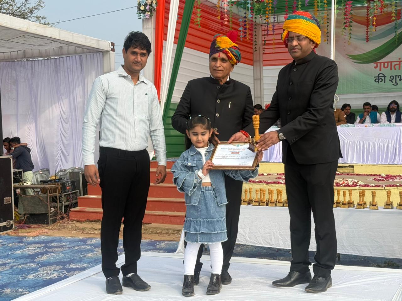 उपखण्ड स्तरीय समारोह में नन्हीं त्विषा नागौरी सहित ब्लॉक की 37 प्रतिभाओं को कला, अभिनय, शिक्षा, खेल, सांस्कृतिक गतिविधियों एवं विभिन्न सामाजिक क्षेत्रों में उत्कृष्ट कार्य करने वाली कुल 37 प्रतिभाओं को मोमेंटो एवं प्रशस्ति पत्र प्रदान कर सम्मानित किया गया। कार्यक्रम में विद्यालय के छात्र-छात्राओं द्वारा देशभक्ति गीतों एवं मनमोहक सांस्कृतिक प्रस्तुतियों ने सभी का मन मोह लिया। देशप्रेम से ओत-प्रोत प्रस्तुतियों पर दर्शकों ने तालियों से विद्यार्थियों का उत्साहवर्धन किया। इस अवसर पर तहसीलदार ललित डीडवानिया, बीडीओ अशेष शर्मा, नगर पालिका के अधिशासी अधिकारी पंकज मंगल सहित बड़ी संख्या में जनप्रतिनिधि, नगर के गणमान्य नागरिक, विद्यालय स्टाफ एवं छात्र-छात्राएं उपस्थित रहे।